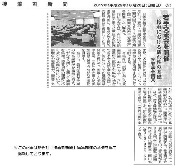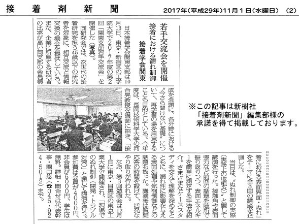 H29.10.13に日本接着学会関東支部が、東京工業大学で開催した第2回若手交流会「接着における表面界面・ぬれ」勉強会にて、"ぬれ制御の実際(実務上の取組み)"と題して講演を行いました。