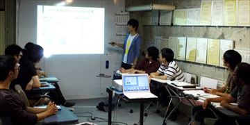 ここでは、研究室メンバーが一同に集い、日々の研究成果をゼミ形式で発表するエリアです。ゼミでは、毎週メンバーが自分の研究進捗を発表します。これにより、学生たちは、自分の努力の成果を第三者へ効果的にアピールするためのプレゼンテーション能力を鍛えます。また、実験結果について、指導教員とともに、徹底的に討論し、学術論文や国際学会などの社会へ発信できるレベルへ仕上げていきます。ゼミ発表では、英語プレゼンを多く導入し、実践的な英語力を養います。そして、研究室ゼミを通じて、いわるゆ対外的な説得力、問題意識の深化、真理の追及といった通常の授業だけでは養えない人間力としてのスキルをトレーニングしていきます。ゼミブースの壁にはOB学生の栄えある受賞賞状が飾られており、現役学生も負けぬよう日々研鑽を積んでいます。