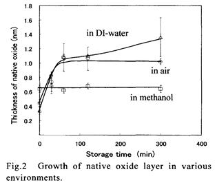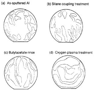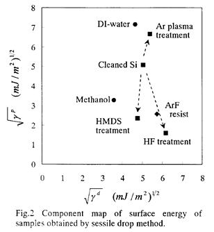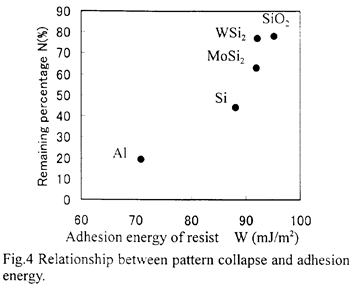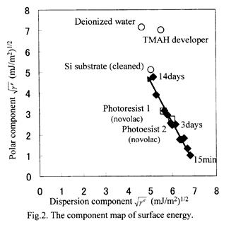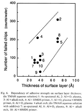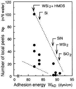 | [abstract] The adhesion of positive photoresist film to some inorganic substrates used as LSI substrate material in dry and wet conditions has been investigated based on surface chemistry. The method of surface energy treatment is used to predict the adhesion energy. The contact angle method is used to measure the surface energy of each substrate. The correlation between the value of two components of surface energy, the polar and the dispersion parts, and adhesion strength is discussed. It is important to control the polar part of surface energy of a substrate in order to achieve high adhesion strength. KEYWORDS : adhesion, surface tension, contact angle, photoresist, intrusion, dynamic memory, semiconductor |