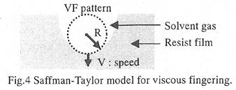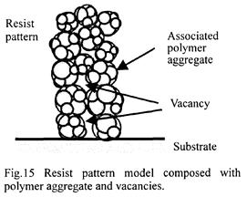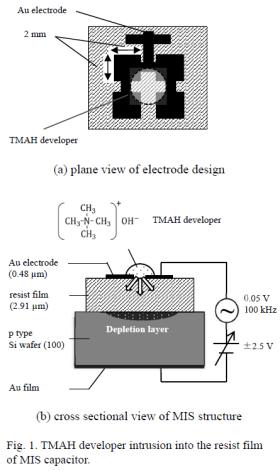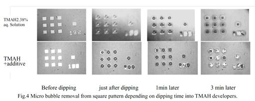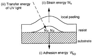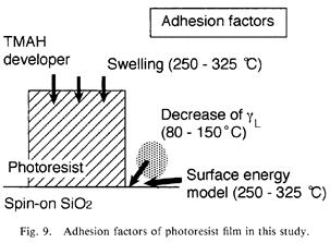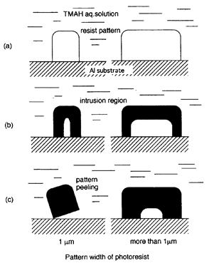 Fig.4 Schematic diagrams of intrusion of THAM aqueous solution and peeling of resist pattern. (a)immediately after dipping into TMAH aqueous solution. (b)intrusion of TMAH aqueous solution into photoresist film. (C)equilibrium of intrusion is almost reached. | |