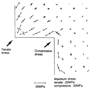 | Fig.4 The principal stress distribution in a photoresist pattern which has two different corners. The distribution was calculated by a two-dimensional finite element method. |
