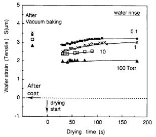 | Fig.3 Variation of wafer strain versus drying time. The resist films were