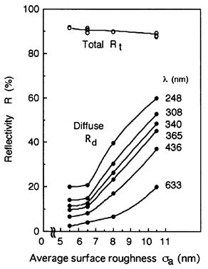 | Fig.2 The plot of reflectivity of air/aluminium interface versus average surface roughness of aluminium film.The open circlesindicate total reflectivity. The closed circles indicate diffuse reflectivity. The diffuse reflectivity was measured using the integration sphere in the spectrometer. |