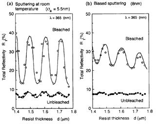 Fig.5 Total reflectivity variation of resist/aluminum substrate system with varying resist thickness. The open circles indicate reflectivity from bleached resist. The closed circles indicate reflectivity from unbleached resist. |