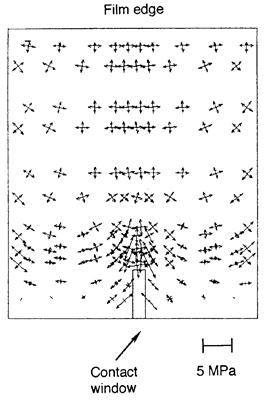 Fig.4 The FEM stress analysis around the contact window. (Plane view) All stresses indicate tensile direction. |