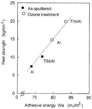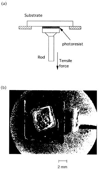 | Fig.1 Test system for resist/substrate adhesion strength. (a) Schematic diagram of a test sample. (b) Photograph of a sample after the peel test. A rod 2.5mm in diameter was adhered to the sample and then peeled. | Fig.2 Correlation between peel srrength and adhesive work Wa. | |