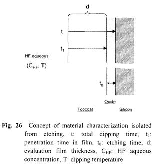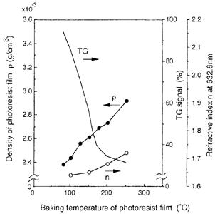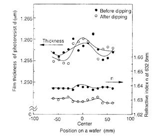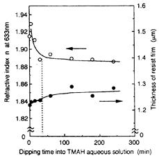 | Fig.3 Dependency of refractive index and thickness of photoresist film on dipping time into TMAH aqueous solution. |
