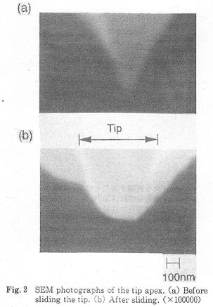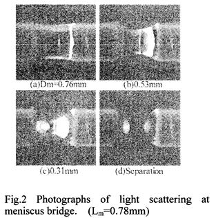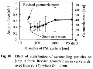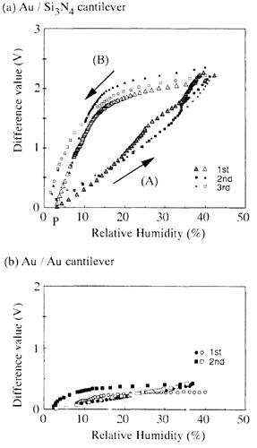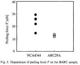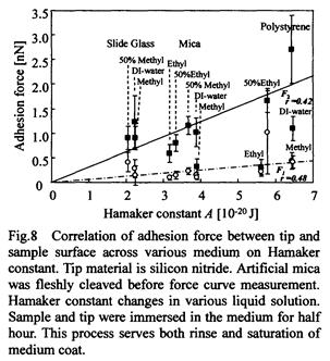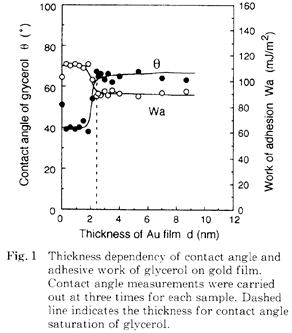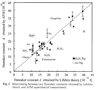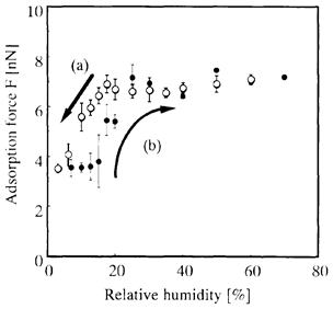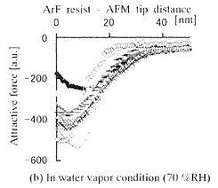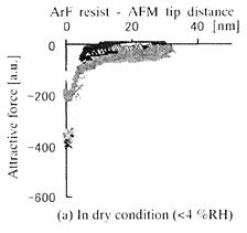 | [abstract] 原子間力顕微鏡(AFM)の微細カンチレバーは,薄膜表面へ表面力(主にファンデルワールス力)によって吸着する。この表面力は,接触角法で測定した薄膜の表面自由エネルギーの極性成分に正の相関を示すが,分散成分には感度を持たない。AFMを用いることにより,大気中で非破壊的に薄膜表面の熱力学的挙動を解析する事ができる。 The micro cantilever mounted in atomic force microscopy (AFM) is adsorped to thin film surfaces due to the surface force such as van der Waal's force. This surface force has positive correlation with the polar component of surface free energy measured by the contact angle method. However, it has no sensitivity to the dispersion component. By using AFM, the thermodynamic properties of thin film surface can be analyzed nondestructively in air. |