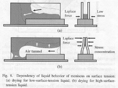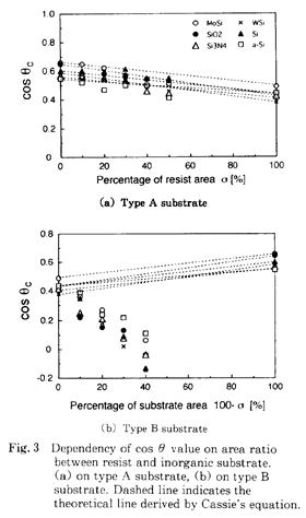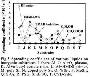 | [abstract] The wetting failure of photoresist occurs during the spin-coating process on the spin-on-glass (SOG) surface. The SOG surface has relatively low surface free energy. By treating the SOG surface with an alkaline aqueous solution prior to the photoresist coating, wetting failure can be prevented. The alkali treatment has the effect of increasing the surface free energy of SOG film, especially in its polar component. The spreading work WS changed from a positive to negative value by the alkali treatment, which can explain the prevention of the wetting failure. KEYWORDS : wetting, surface free energy, contact angle, photoresist, spin-on-glass, spin coating, thermodynamics, condensation, photolithography, trilayer resist lithography, LSI |