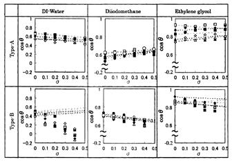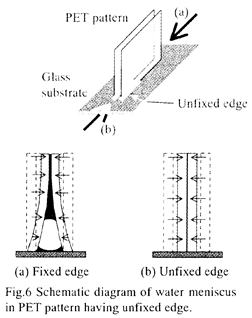 | [abstract] The effect of roughness on the wettability is studied. The rough surface is constructed with photoresist micropatterns which are formed by photolithography. The aspect ratio is defined as the length ratio between the pattern space and its height. Contact angles of three kinds of liquids, pure water, diiodomethane and ethylene glycol, increase and saturate with the increase of the aspect ratio. The wetting behavior of pure water of which higher surface energy is extremely complex. KEYWORDS : wetting, adhesion, photoresist, LSI, lithography, surface free energy, contact angle, thermodynamics |