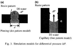 | [abstract] Adhesion strength of a photoresist during pattern development decreases as penetration of an alkaline aqueous solution into the photoresist film increases. The penetration is accelerated by increasing the quantity of residual solvent in the photoresist film. Resistance measurements confirmed the penetration. The tensile stress of photoresist films increases as the penetration increases. The creation of inner stress also causes adhesion failure during HF etching. These phenomena cannot be explained by a balance model of surface energy. Therefore, we conclude that the increase in tensile stress causes adhesion loss during both pattern development and HF etching. KEYWORDS : adhesion, surface energy, photoresist, density, penetration, solvent, stress, semiconductor |